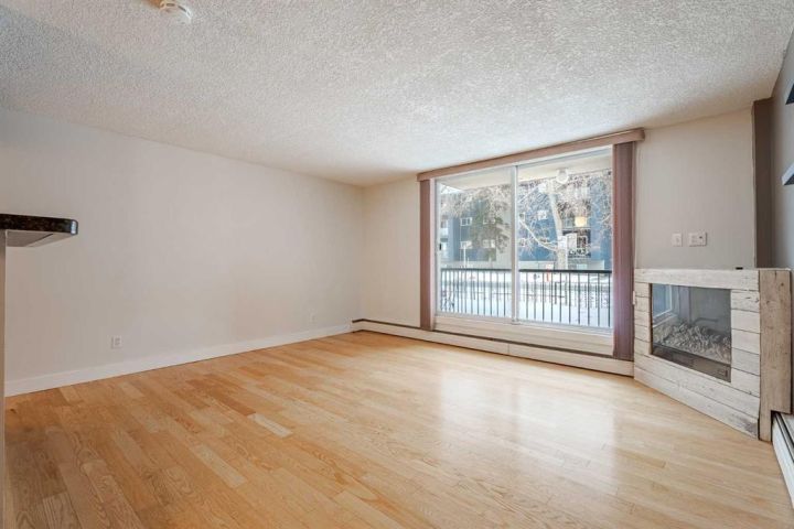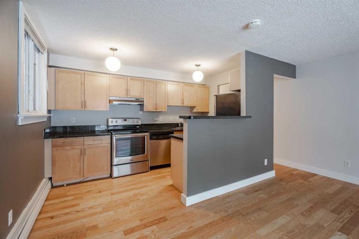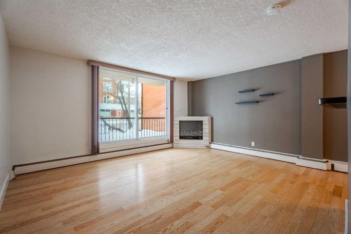Charming and spacious ground-floor corner condo offering around 800 sq ft of comfortable, low-maintenance living in a highly walkable location. This beautifully updated 2-bedroom, 1 full 4-piece bath unit features gleaming hardwood floors and fresh paint throughout, creating a warm, move-in-ready space in Kensington! You’ll love the open-concept layout that seamlessly connects the renovated kitchen to the living room. The kitchen boasts granite countertops, newer cabinets, and modern finishes, making it perfect for cooking and entertaining. The bright living room includes an elegant electric fireplace and opens onto a large, private south facing balcony – ideal for relaxing or enjoying your morning coffee. The totally renovated bathroom offers contemporary fixtures and a clean, stylish design. Additional updates include newer windows and interior doors, as well as a convenient new stacked washer and dryer in-suite. There is a handicap accessible ramp in front of the building . An assigned surface parking stall is included for your convenience. Located just a short walk to shops (Safeway), bus stops, Sunnyside LRT station, next door to Acme Pizza and nearby parks, this condo combines comfort, style, and an unbeatable inner-city lifestyle. Aggudo Coffee, Flippin Burgers, Kim’s Katsu, Regal Cat Café, Bombay Tiger, Red’s Diner.. just to name a few eateries minutes from your home. Perfect for first-time buyers, downsizers, or investors!