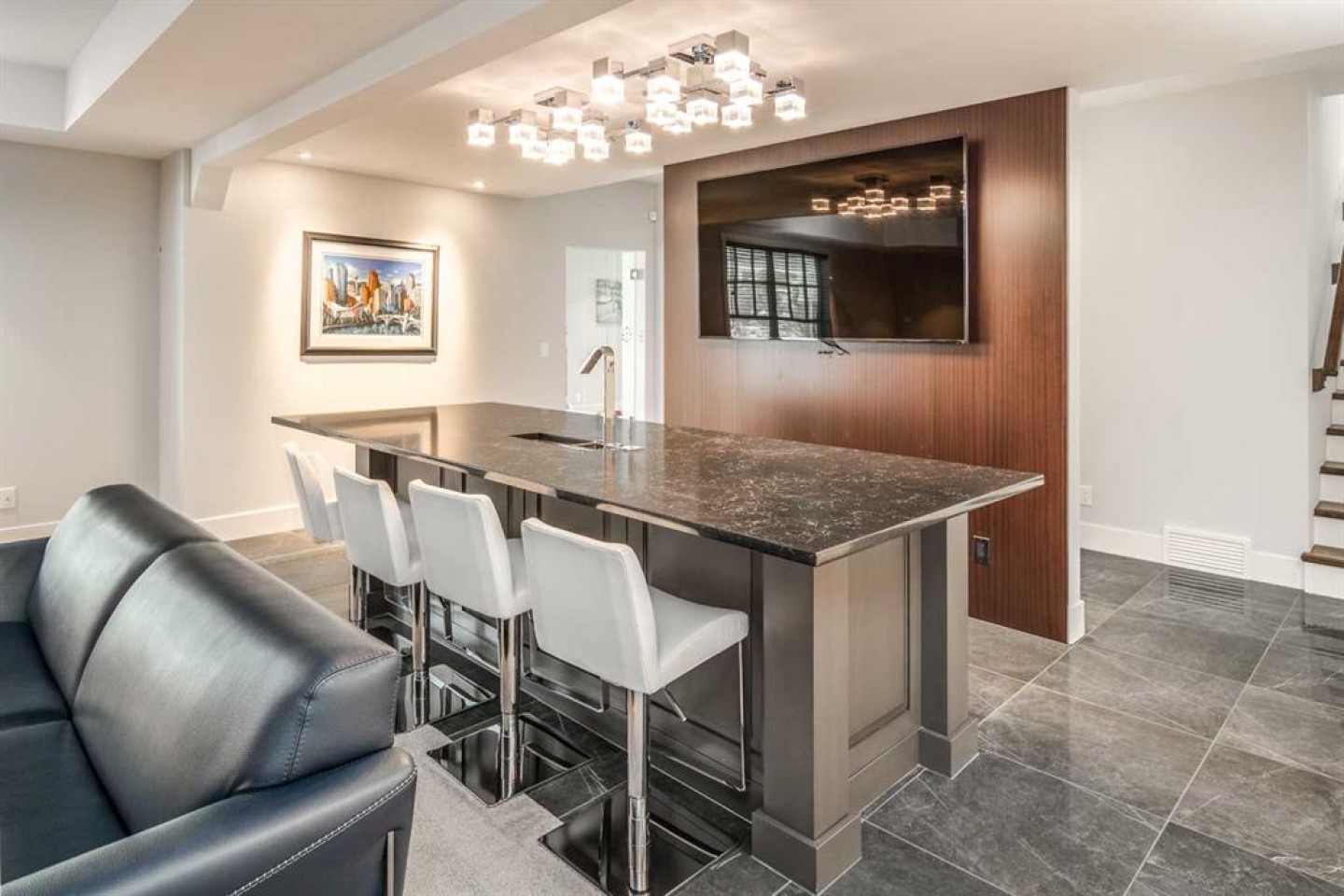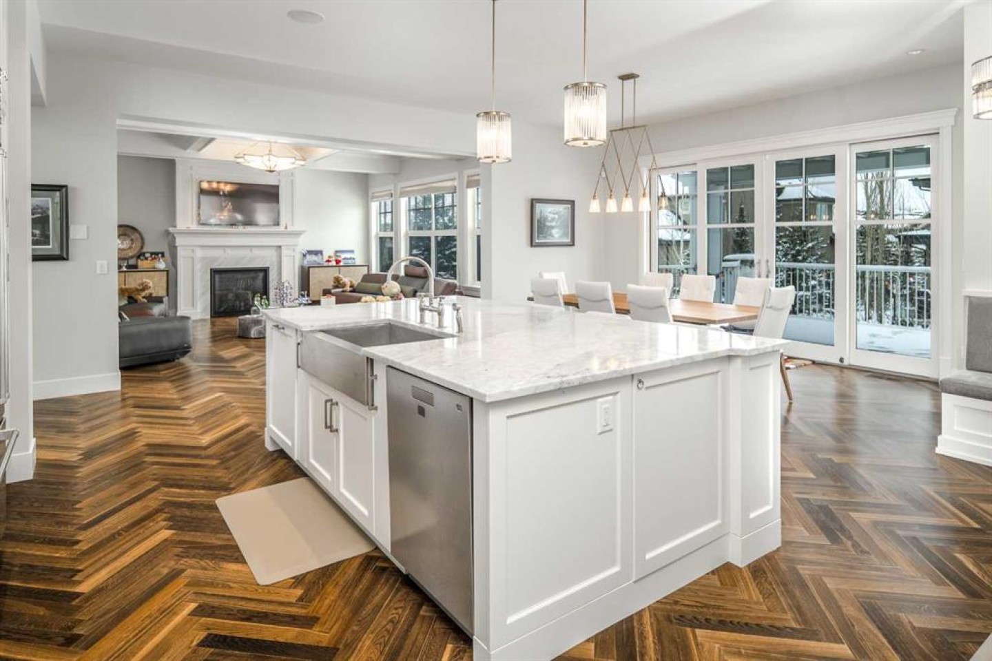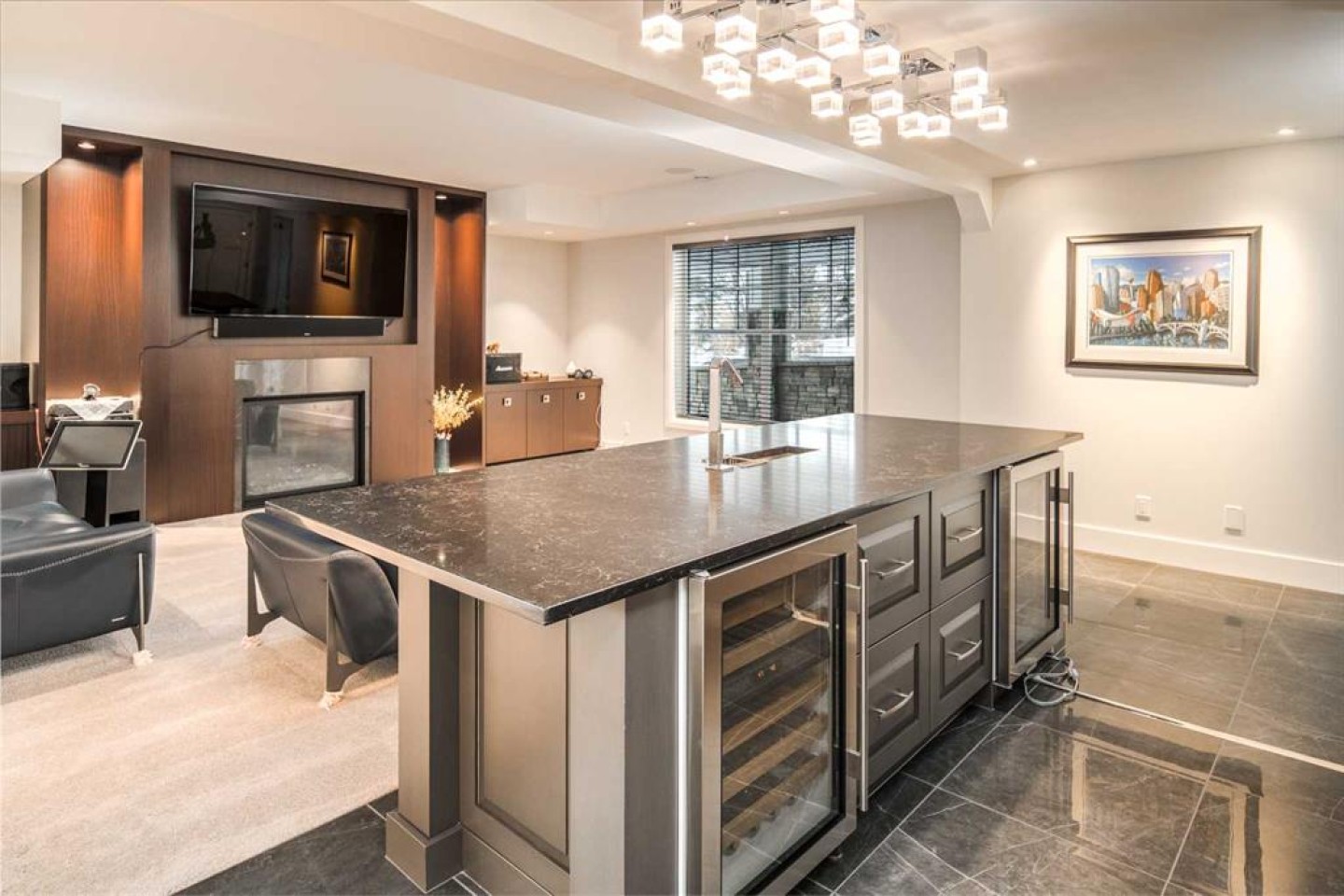 Welcome to this exquisite custom estate home by Wolf Custom Homes, nestled in the prestigious community of Watermark. Boasting over 5,400 sq. ft. of unparalleled craftsmanship and elegance, this former SHOWHOME offers tons of upgrades exemplifies luxury living. The house is in immaculate condition, having been used only occasionally by the owners. From the moment you step inside, you are welcomed by stunning luxury hardwood flooring that flows throughout the main level. The heart of the home is the gourmet chef’s kitchen, featuring beautifully crafted cabinetry, an oversized island with marble countertops, and top-of-the-line appliances, including a Sub-Zero fridge, Wolf gas stove and built-in oven, and an Asko dishwasher. Adjacent to the kitchen, the bright and inviting dining area and living room are adorned with expansive windows, allowing natural light to fill the space. A striking fireplace adds warmth and sophistication to this open-concept layout. For those who love to entertain, a formal dining room and a stunning 4-season sunroom extend onto an expansive, covered balcony—perfect for year-round enjoyment. A spacious main-floor office, complete with custom-built desk and shelving, offers the ideal work-from-home setup. A thoughtfully designed mudroom with a built-in bench and ample storage ensures effortless organization. Upstairs, retreat to the lavish primary suite, where a spectacular walk-in closet with custom spa-like 5-piece ensuite. Indulge in the free-standing soaker tub, oversized glass-enclosed shower, and dual vanities. Two additional generously sized bedrooms, each with its own walk-in closet and private 4-piece ensuite, provide ultimate comfort. A large bonus room and a convenient upper-floor laundry room complete this level. The fully developed walk-out basement, enhanced with in-floor heating, extends the home’s luxurious appeal. It boasts a spacious entertainment area with a fully equipped wet bar, a modern fitness room, an additional bedroom, and a beautifully appointed four-piece bathroom. Step outside to your private backyard oasis, where breathtaking views, lush landscaping, and elegant decorative LED system (10K value) and garden lighting (6K) create the perfect setting for entertaining or quiet evenings under the stars. Located in the exclusive estate community of Watermark, this home provides the tranquility of country living with the convenience of city amenities just minutes away. Enjoy scenic pathways, parks, playgrounds, and the renowned Central Plaza with a pavilion, picnic areas, firepit, sports courts, and lush green spaces. Experience the pinnacle of luxury—book your private showing today!
