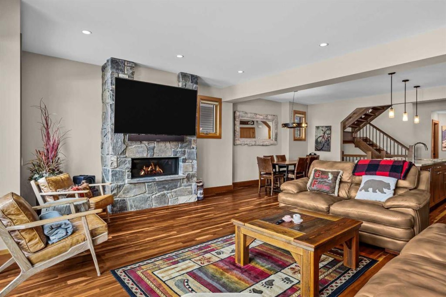 Light, space, and effortless mountain living come together in this exceptional 3-storey townhome—one of the final 4-plex residences built by Elk Run Developments. With over 2,400 square feet, this home is designed for those who love to gather, entertain, and enjoy the Canmore lifestyle. The top level features two spacious bedrooms, each with its own ensuite, creating a peaceful retreat at the end of the day. The heart of the home is the second level, where a stunning Legacy Kitchen anchors the space with a large island, Italian range, oversized fridge/freezer, and wine fridge—perfect for hosting dinners for 10+ in the generous dining area. Floor-to-ceiling windows fill the living room with light and open directly to the front deck. The entry level offers heated floors, a fourth bedroom with full bath, a large mudroom, and welcoming foyer—ideal after a day on the trails. Four dedicated parking spots, including a double garage with epoxy flooring, make life easy. All just one block from the river pathway system and a short walk to shops and restaurants in South Canmore. Spacious, low-maintenance living designed for the mountain lifestyle—with all furniture included, except the TV above the living room fireplace, making this a truly move-in-ready opportunity.